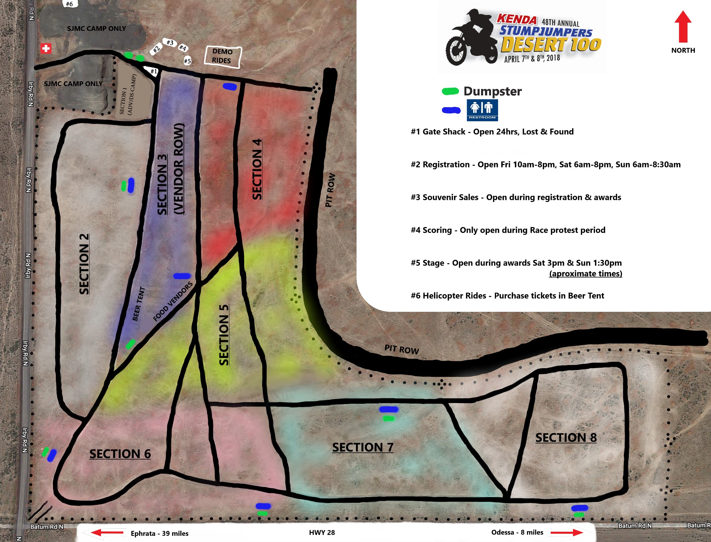 The gates will open at NOON THURSDAY April 4th. You are able to get in and setup your camp, but we ask that no riding take place until Friday morning. NO EXCEPTIONS! If you arrive before Noon on Thursday, you will NOT be able to park on the shoulder of Irby Road or Hwy 28. Last year we received report from a very angry neighbor that people were trespassing on his property trying to turn around in his driveway. To avoid this problem, we ask that you NOT turn onto Irby Road until noon on Thursday. Please go visit the town of Odessa if you show up early, or line up on Kagele Road so you are just South of Hwy 28 across from camp. If you get to Odessa early, head into town and stock up on groceries and gas. The town of Odessa is a huge supporter of the Stumpjumpers and the offroad community, so the more support we can give them, the better. The gate fee is $10 per person. 12 & Under are free. CLICK HERE FOR MAP of camp area.